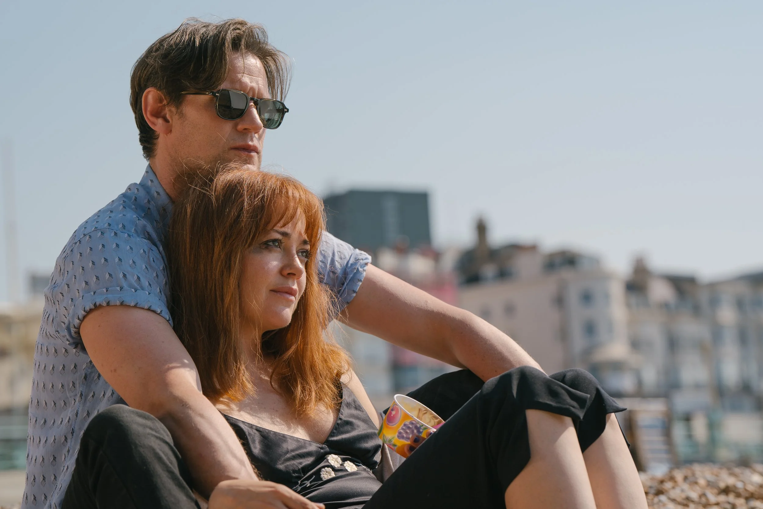 Two people sitting in a car on a rainy day, looking outside through the windshield with raindrops on it. The man on the left has curly dark hair and is wearing a black jacket, and the woman on the right has long blonde hair and is wearing a patterned View fullsize